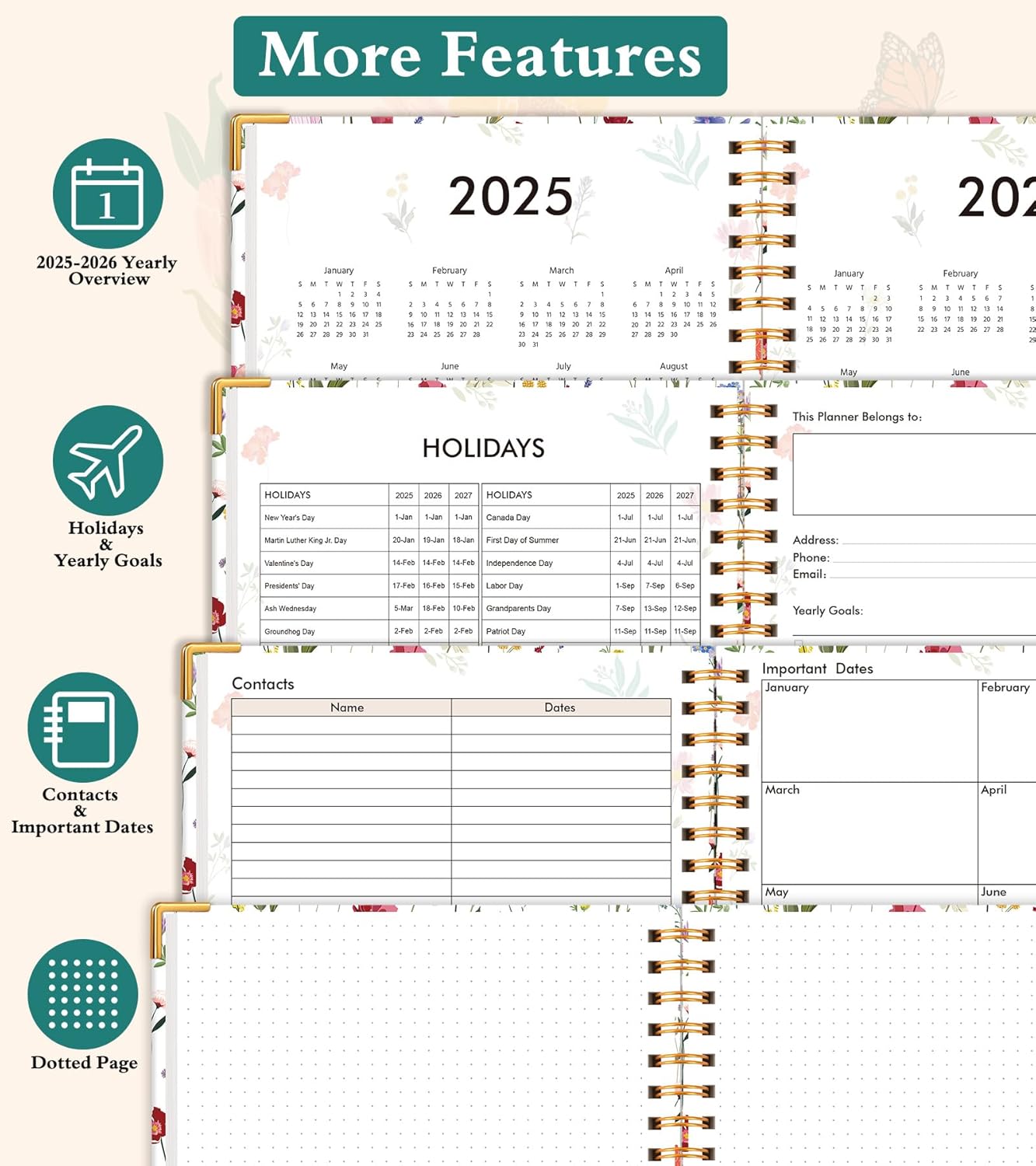 【Upgraded Quality】 Unlike other flimsy planners, our daily 2025-2026 appointment planner features a fountain pen friendly paper for easy writing, no ink bleed through. The metal spiral spine that enables the planner to lay flat when open. A sturdy hard cover, ensuring hold up for the entire year. Monthly tabs for simplifying navigation are laminated to resist tears. Pen holder, elastic closure, inner pocket, removable bookmark ruler boosting your planning convenience. 2025-2026 agenda book is perfect for busy planners.