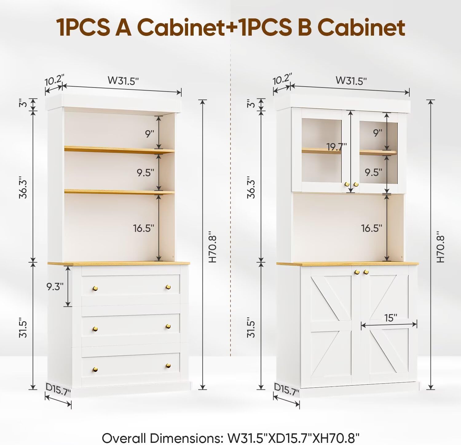 71″ Farmhouse Kitchen Pantry Cabinet Set of 3, White Freestanding Coffee Bar Hutch with Glass Doors, Drawers & Adjustable Shelves, Large Storage Cabinet with Microwave Stand for Living Room & Kitchen