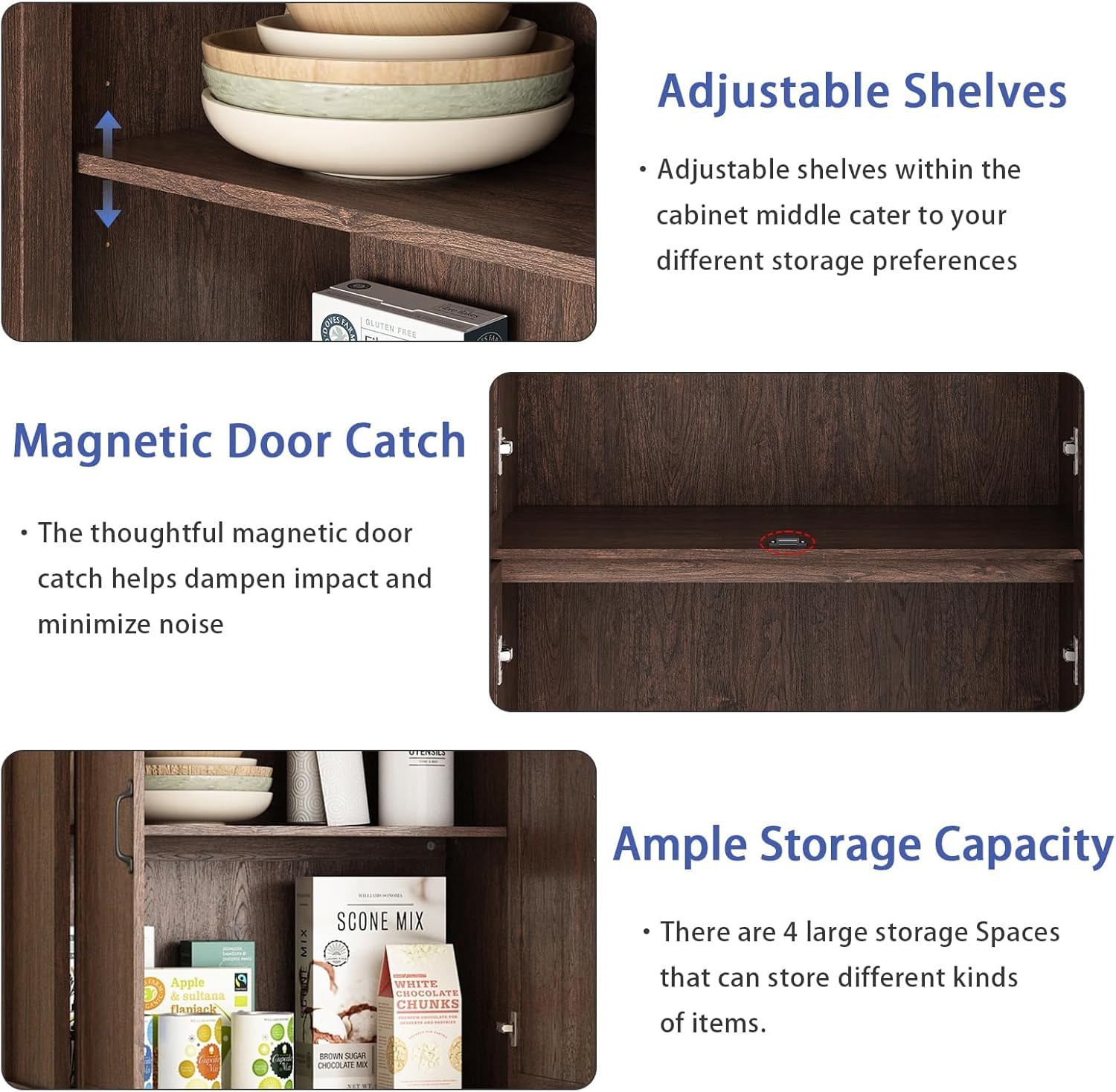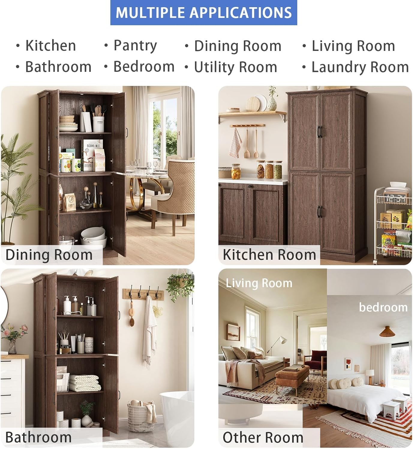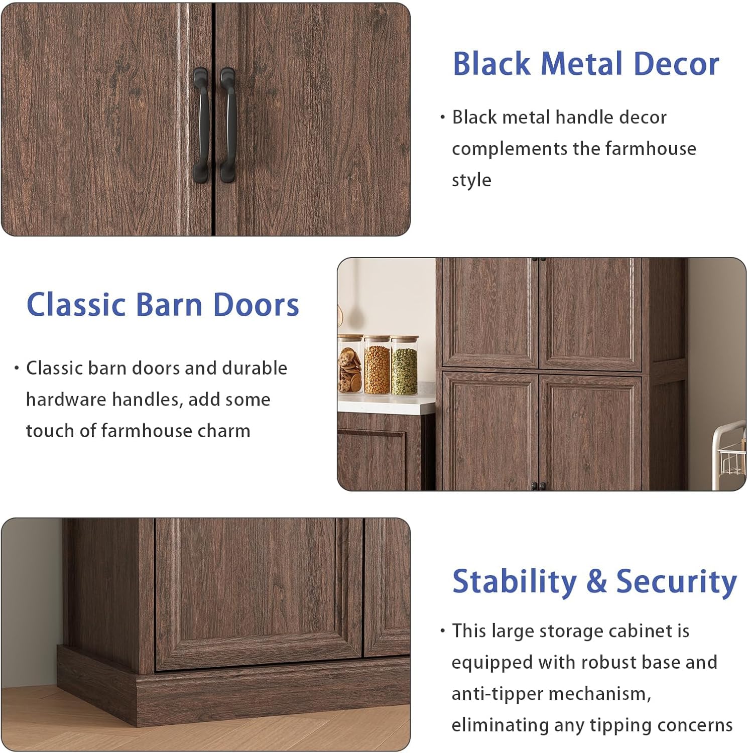【Sturdy Construction】Pantry cabinet built with high-quality wood and scratch-resistant finish,The reinforced frame and anti-tip design of this wooden storage cabinet ensures safety for families with children or pets.