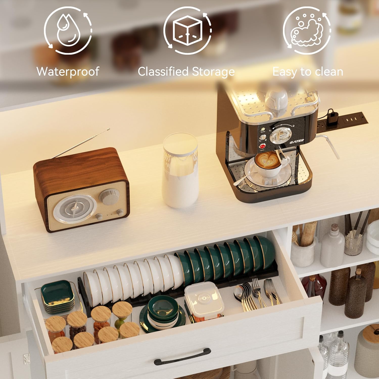 【LED Light & Charging Station】FJTJBSI kitchen pantry cabinet features an integrated charging station—including 2 USB ports, 1 Type-C port, and 2 standard outlets—for convenient power supply to appliances like coffee makers. Its LED lights offer three color modes (bright white, warm white, warm yellow), adding elegance and ambiance to your space.