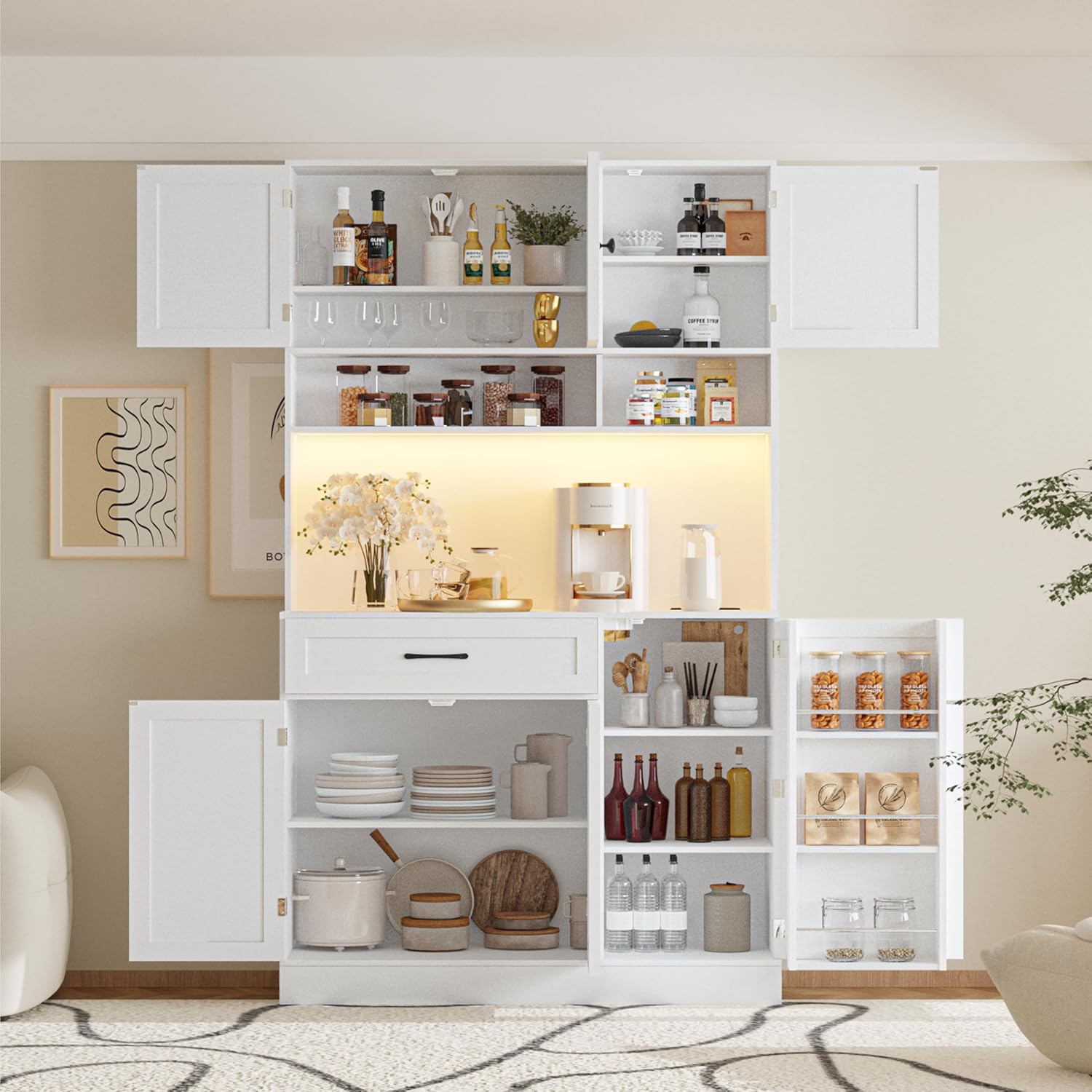 【Elegant Modern Style】This modern food pantry features smooth lines, elegant metal handles, and a glossy finish. The minimalist design brings understated elegance to your dining room or kitchen, harmonizing perfectly with modern decor.