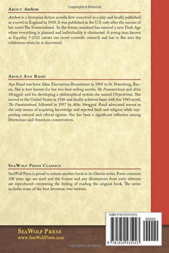 Anthem is a good story with unusual characters, plot and setting. It is also an excellent introduction to the thought of philosopher novelist Ayn Rand and the ideas of liberty in general.It is a story that begins in a captive culture without even the hint of individuality let alone of individual liberty. One man who does not even know he is a single human being because the words for it have been erased from his society, slowly discovers that he has a mind, he can learn, he can love, and he can live as something other than a cog in a mindless machinelike society. He discovers what it is to be a man. And the reader discovers the importance of having the words to describe and express individuality.This is a short interesting novella with profound implications. If you have not read it, it will be fun to read and worth the short time it takes to read. You may come to love it as some of us do and revisit it happily from time to time.Newer editions also include a copy of the older edition as it was first published in England in 1937 with editing markup for the American publication in 1946. For those interested in editing, it is a fascinating example of how to change the mood and tone of a story while leaving the plot and message intact.