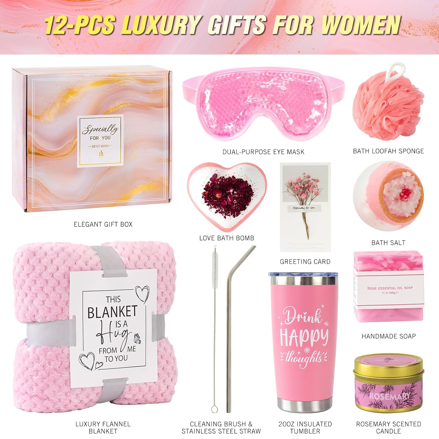 12 PCS Self Care Gifts for Women: HAIINNA Gift Relaxing Spa Gifts Basket presents an elegant assortment of carefully crafted, considerate indulgences, including luxury flannel blanket,20oz insulated tumbler, rosemary scented candle, handmade soap,love bath bomb, stainless steel straw(match for cleaning brush), bath salt, bath loofah sponge, dual-purpose eye mask, flower gift card and elegant gift box. Send such gift baskets for women to let her enjoy a cozy & leisure time. It’s the perfect gift for those moments of blissful tranquility.