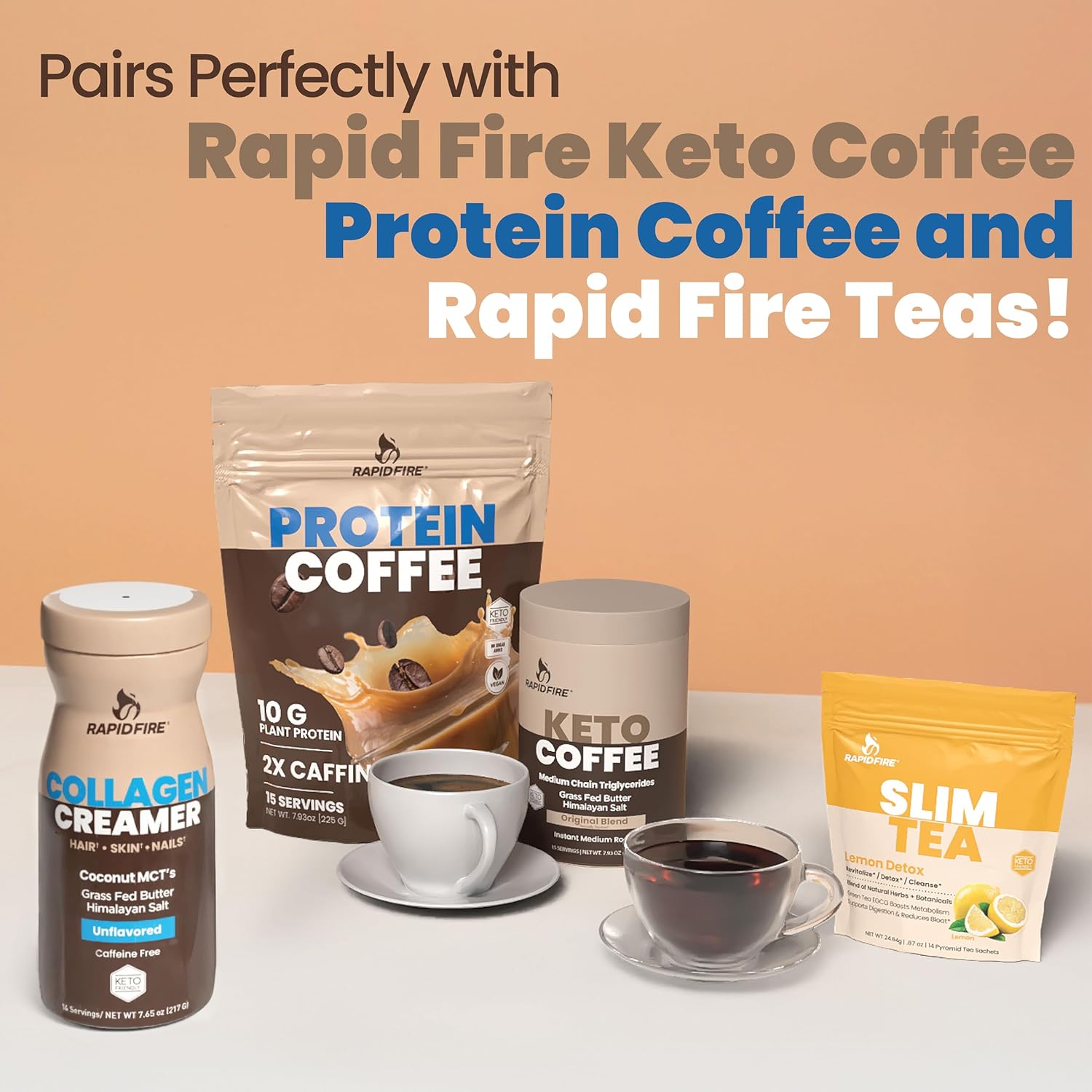 At rapid fire, we understand that you may not want to part from your usual coffee brand, but you still want to embrace the benefits of functional coffee and the ketogenic diet. Have no fear – that’s why we created the rapid fire collagen creamer. This healthy functional coffee and tea creamer has the same rich ingredients of rapid fire ketogenic coffee, including coconut MCTs (medium chain triglycerides), grass-fed butter and Himalayan pink Salt. These ingredients help provide sustained energy, help your body burn fat and promote satiety (fullness) so you have less of an appetite. But collagen creamer is so much different than any creamer You’ve tried. In addition to the ketogenic ingredients described above, this functional creamer is loaded with health-building collagen peptides. One of the most well-known benefits of collagen is its ability to promote glowing, vibrant skin. This essential protein provides elasticity to the skin, helping it to appear more youthful and healthy. Rapid fire collagen creamer combines coconut oil with hydrolyzed Collagen for a healthy and delicious addition to your morning coffee. Directions: mix 2 tablespoons of rapid fire collagen creamer into prepared coffee, tea or cocoa. Stir and enjoy. Ingredients: ketogenic creamer blend [coconut oil, MCT Oil (medium chain triglycerides), butter, grass-fed butter], hydrolyzed collagen, Guar gum, Himalayan Pink Salt and silicon dioxide.