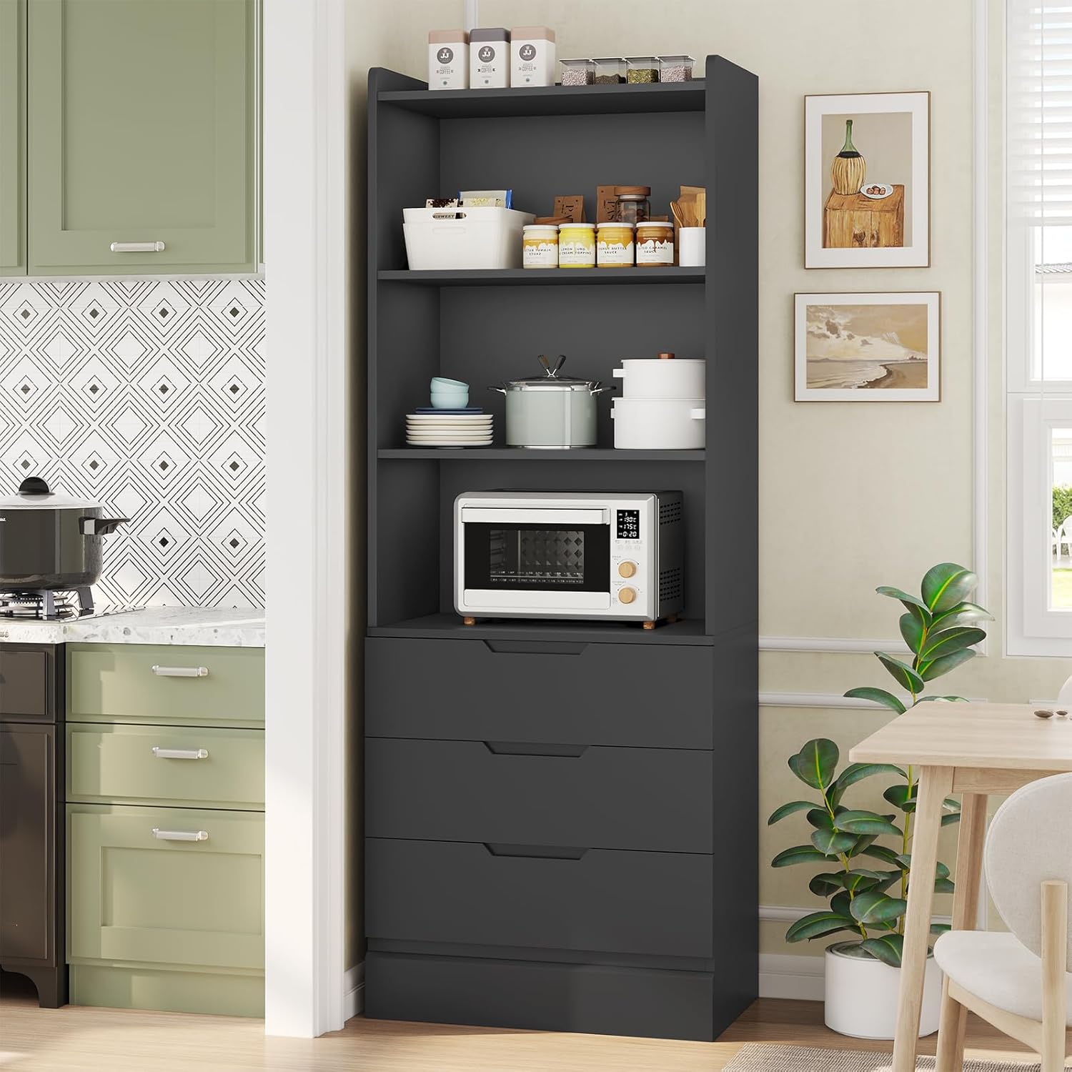 3 Drawer to store tableware, spoon, seasoning, etc.Or some smaller things, such as unused dishwashing sponges, rags, garbage bags.3 Open Shelves to place microwave, coffee machine, hot kettle, cup, wine, bowl and plates,etc.Top Storage Space,you can place photo frameworks, vases, etc.