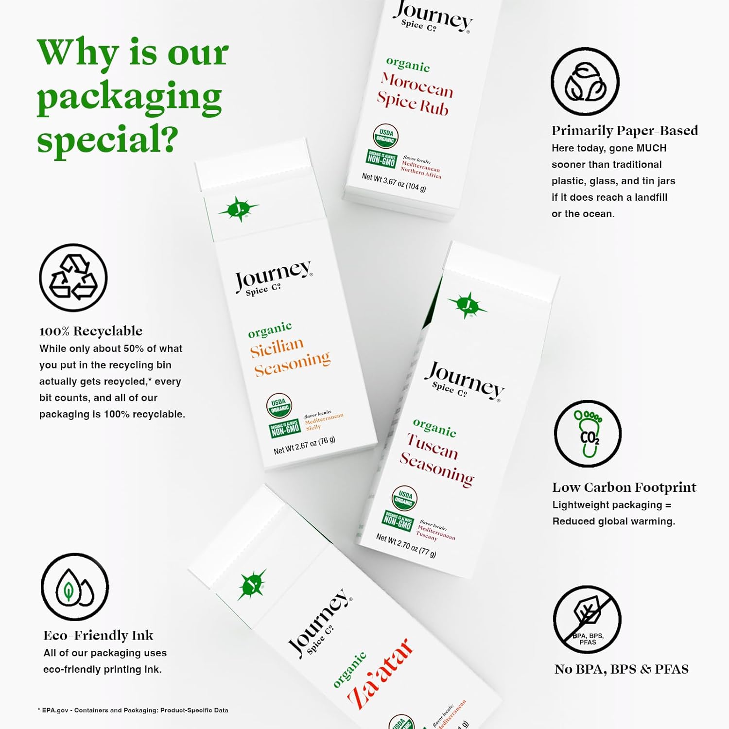 I have been having fun trying all of these seasonings, and they are all delicious. I especially like the zaatar and Moroccan seasoning. The Moroccan was delicious in a baked chicken wrap with hummus, lettuce, and the zaatar sprinkled in. Compared to the Trader Joe’s Zaatar I tried before and some other one that smelled musty and had overly toasted sesame seeds, Journey Spice’s wins hands down.I also like how this brand is trying to do good for the planet, and the packaging design is truly innovative. Can’t wait to try them all!