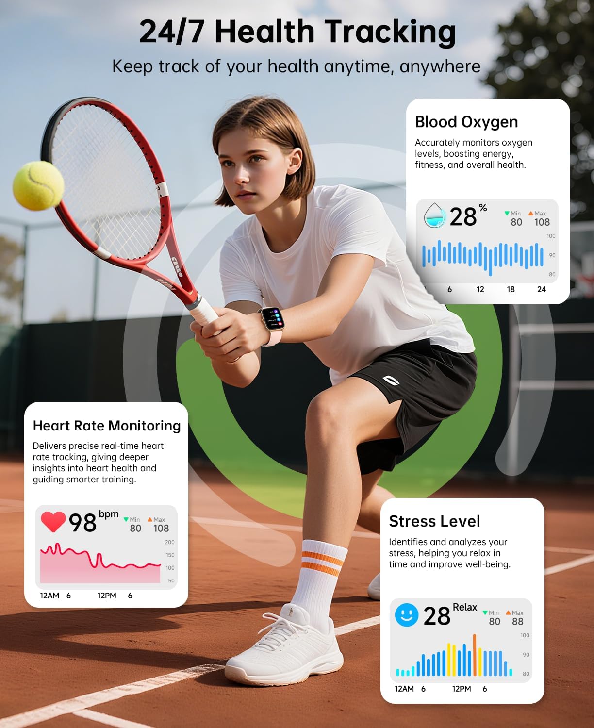 【24/7 Health Monitoring, Accurate & Reliable】This iOS/Android smartwatch is a great fitness tracker. It uses a high-precision wrist PPG sensor, integrating blood oxygen, heart rate, and sleep monitoring technologies, which deliver accurate data to help you conveniently understand your health anytime.