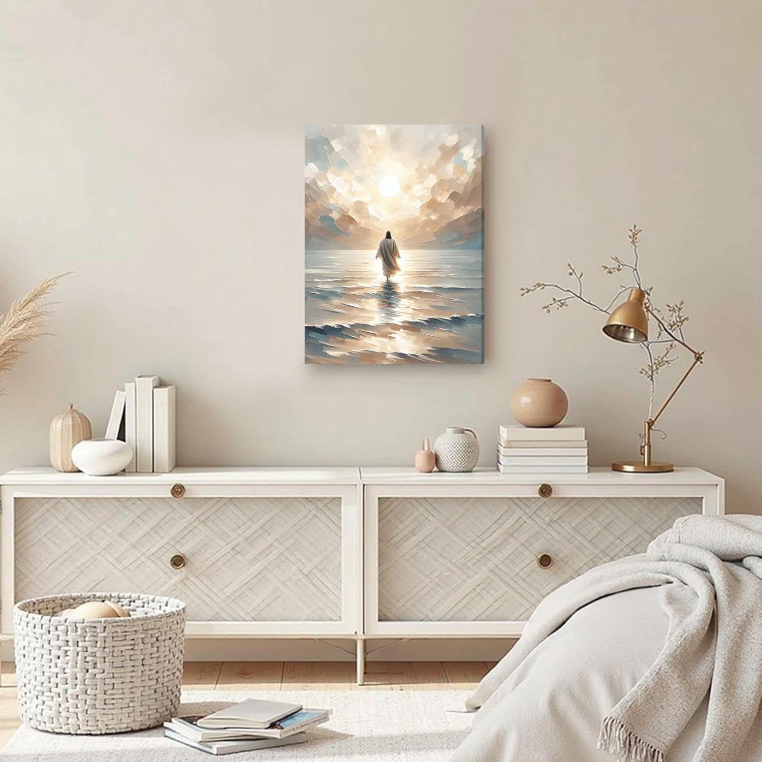 Biblical Scene of Serenity Christian Jesus Wall Art: Immerse yourself in the tranquil depiction of Jesus Walking on Water with this Christian canvas wall art, a serene jesus painting; This modern artwork captures a powerful scene of faith and peace, bringing a serene and inspirational ambiance to your home, church, or office, enhancing any space with its spiritual presence and timeless jesus decor as perfect christian wall decor