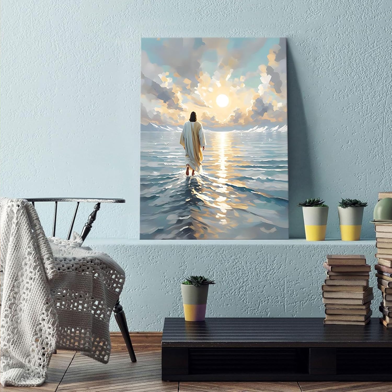 Jesus Walking On Water Canvas Wall Art Christian God Wall Decor Picture Religious Spirit Faith Poster Print for Living room Bedroom Church Decoration, 12x16in
