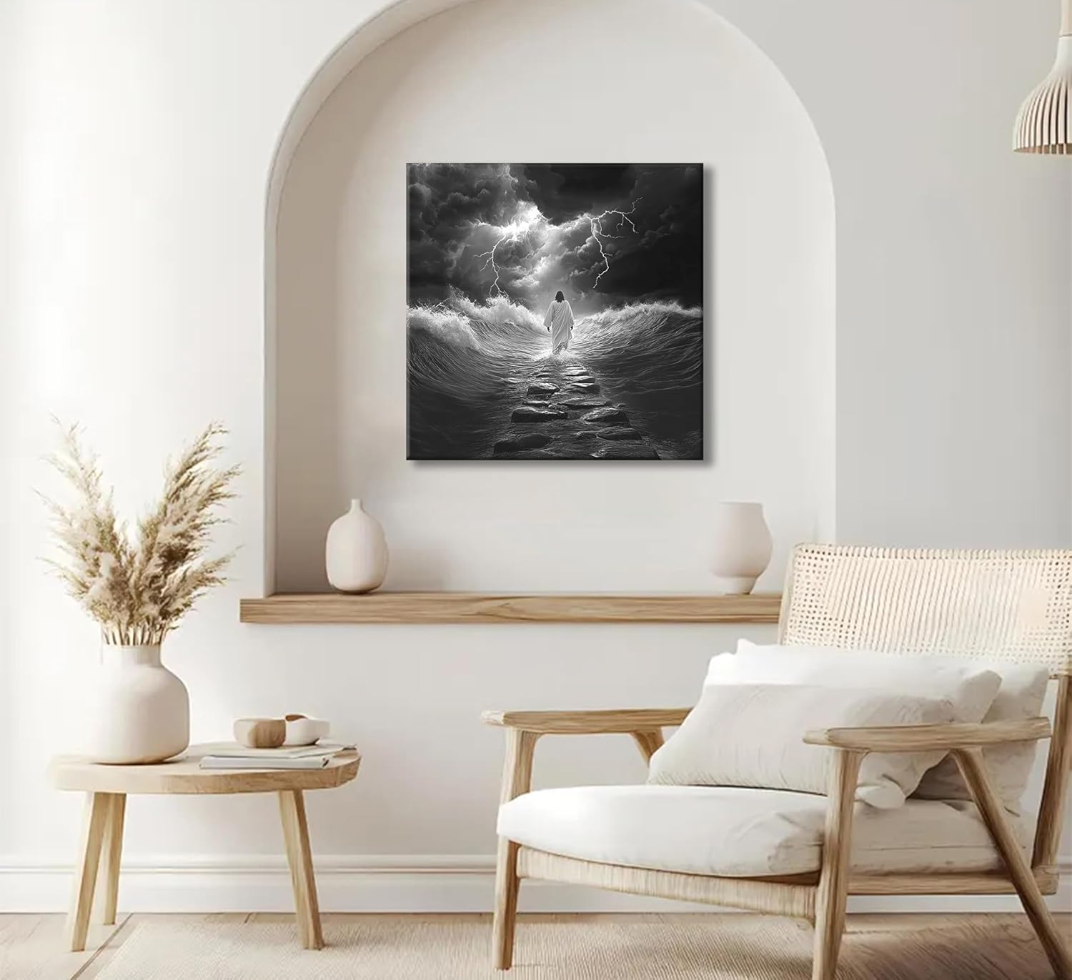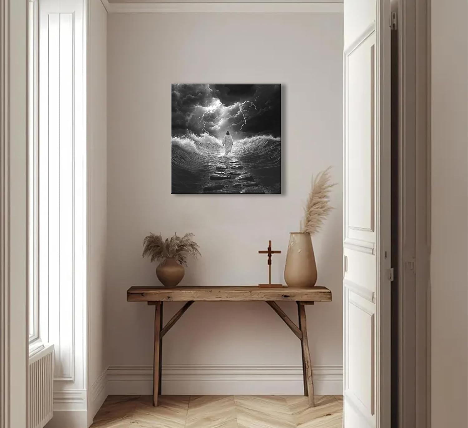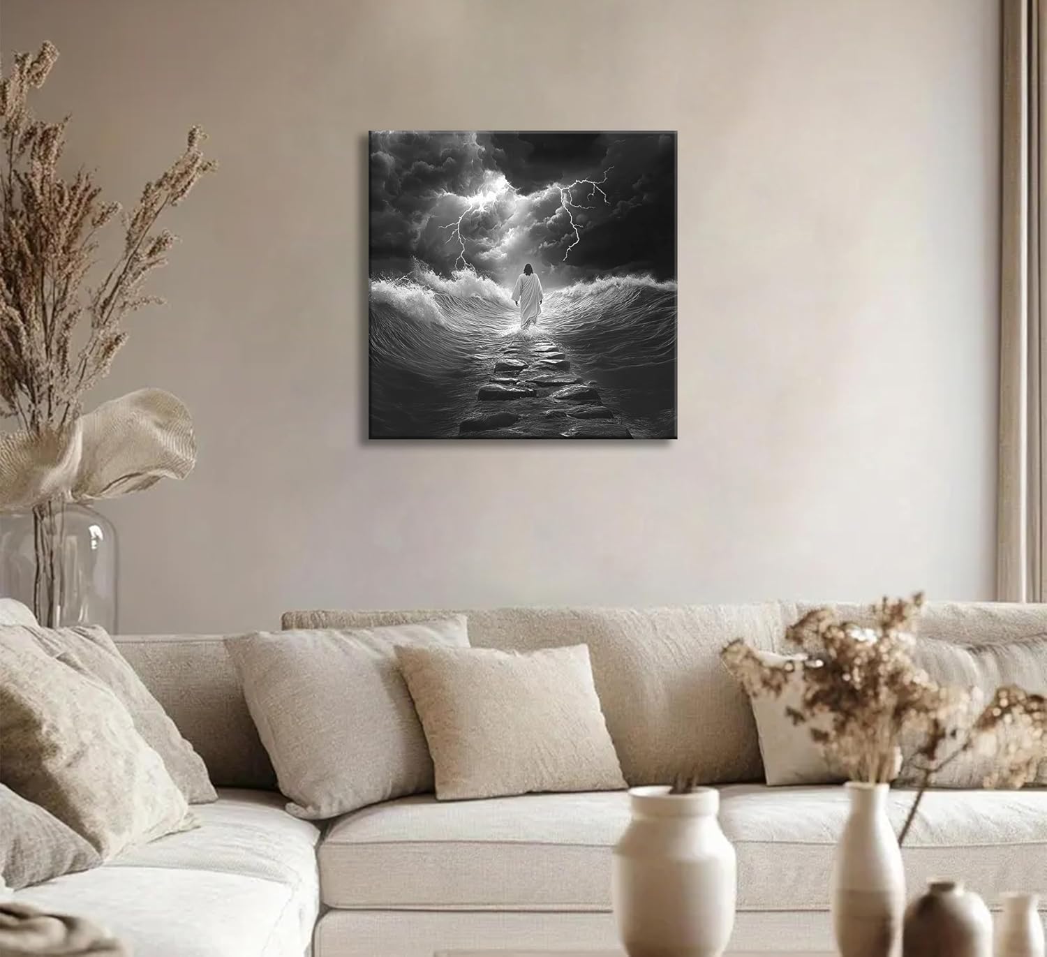 This 20 x 20 canvas took my breath away the moment I unwrapped it. The image is rich with symbolism—dark waves rising, lightning tearing through the sky—and there, right in the center, a solitary figure in white walking calmly down a path of stone.Yes, I believe we all know Who it is. And that’s what makes this piece so powerful.There’s no text, no embellishment—just visual truth. A quiet yet fierce reminder that no matter how chaotic the storm becomes, He walks ahead of us. Always.The quality is excellent—sharp detail, beautifully stretched canvas, and a size that makes it stand out without overwhelming the room. Even my husband, who’s not usually moved by wall art, was struck by it. It now hangs in our home as a daily encouragement and a gentle strength.✅ High-quality canvas✅ Striking image with deep emotional impact✅ Meaningful, calming, and bold✅ A beautiful gift for anyone of faithThis isn’t just wall art. It’s a moment of peace. A piece of faith. A still voice in the middle of the storm.