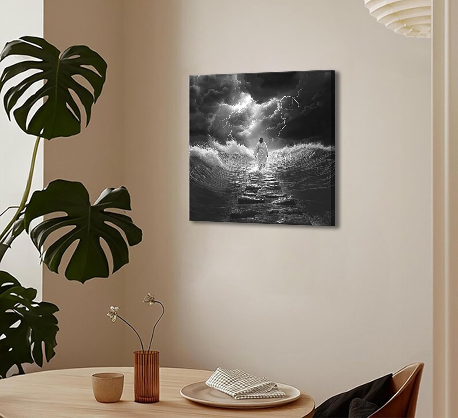 This artwork makes a deep impression from the moment you see it. While the product images are accurate, the real-life piece is even more striking. The dark surrealist style, with its intense light-and-shadow contrast, sets a dramatic tone, but what truly stands out is that Jesus is not facing the viewer. Instead, He is shown walking away, His back to us, striding across the stormy sea with unwavering calm. That choice of perspective evokes awe and reverence, as if you’re witnessing a sacred moment unfold quietly before you.The level of detail is exceptional, you can see the foamy waves, the jagged lightning in the sky, and textures that bring the storm to life. There are also stones rising from the sea, which aren’t part of the biblical account but spark curiosity and conversation. This piece becomes more than a decorative item, it naturally invites others to ask questions, opening the door to talk about Jesus, faith, and the miraculous.The canvas arrived well-packaged and undamaged. Colors are vibrant and pop under natural light, and the frame is solid and ready to hang. My version is 50cm x 50cm, perfect for just about any room, whether a living space, office, or sanctuary.Overall, this is an expressive, high-quality print that blends art and spiritual reflection beautifully. It inspires contemplation and makes a quiet but powerful statement on any wall.