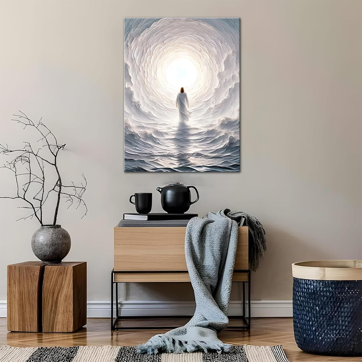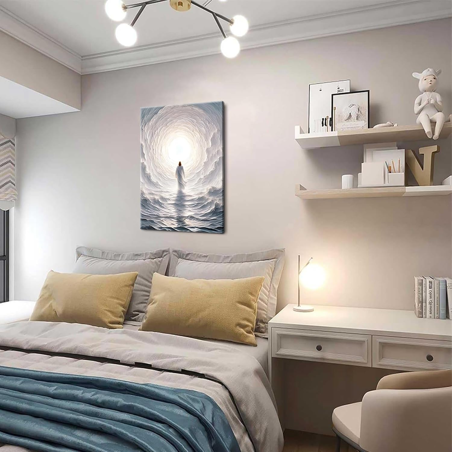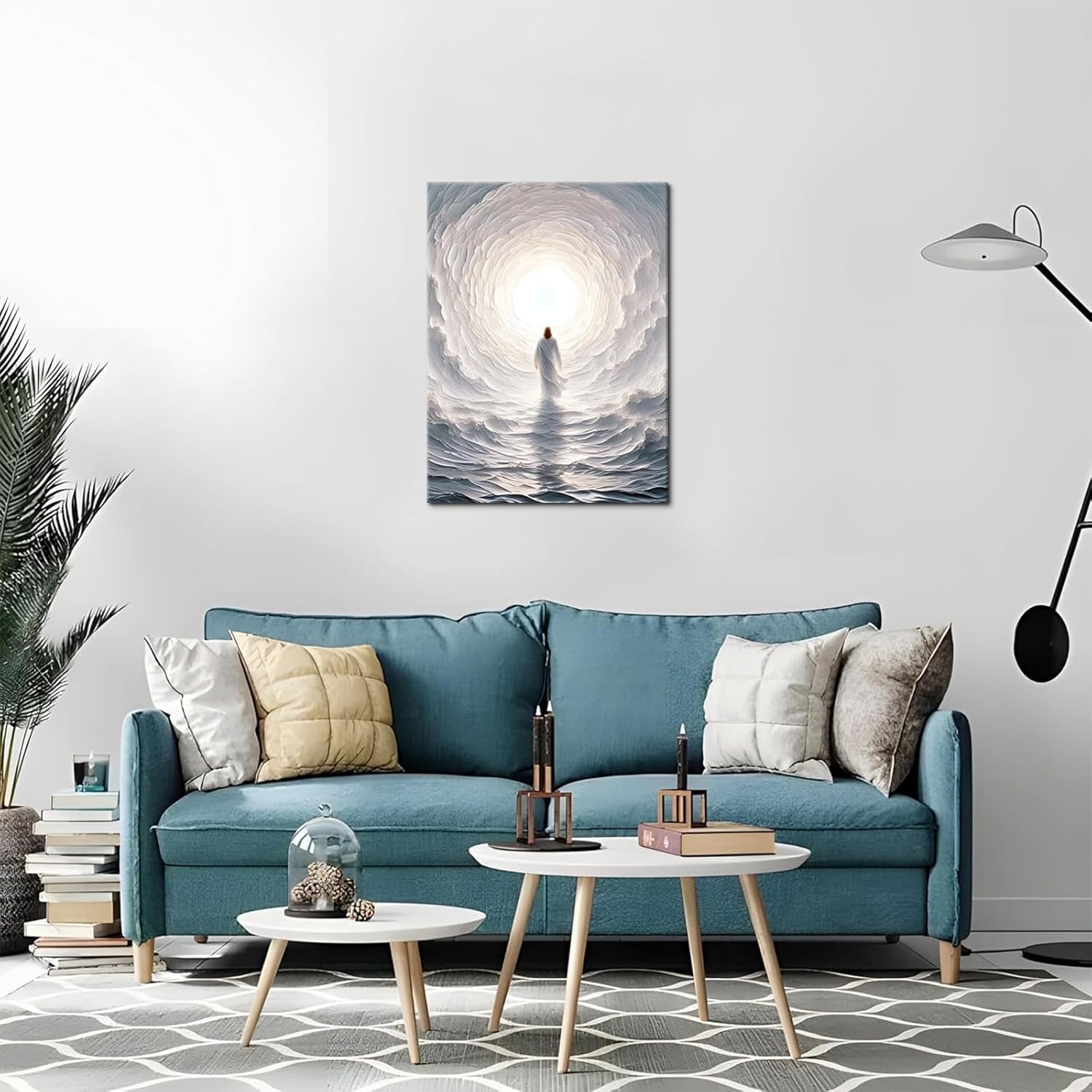 Biblical Bedroom Wall Decor Painting Picture : This posterJesus walking on water to wards the viewer, with white clouds swirling around him,a bright light is at the center of the scene, creating a heavenly, hyper-realistic atmosphere,bringing spiritual tranquility to any space, perfect for those who want to add a meaningful image of Jesus as wall decoration in their home, and enjoy this beautiful Jesus decorative painting every day, bringing warmth and inspiration to your home