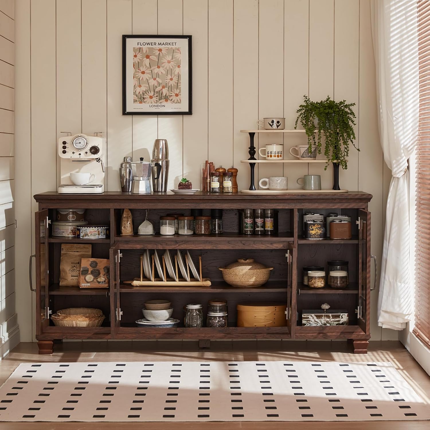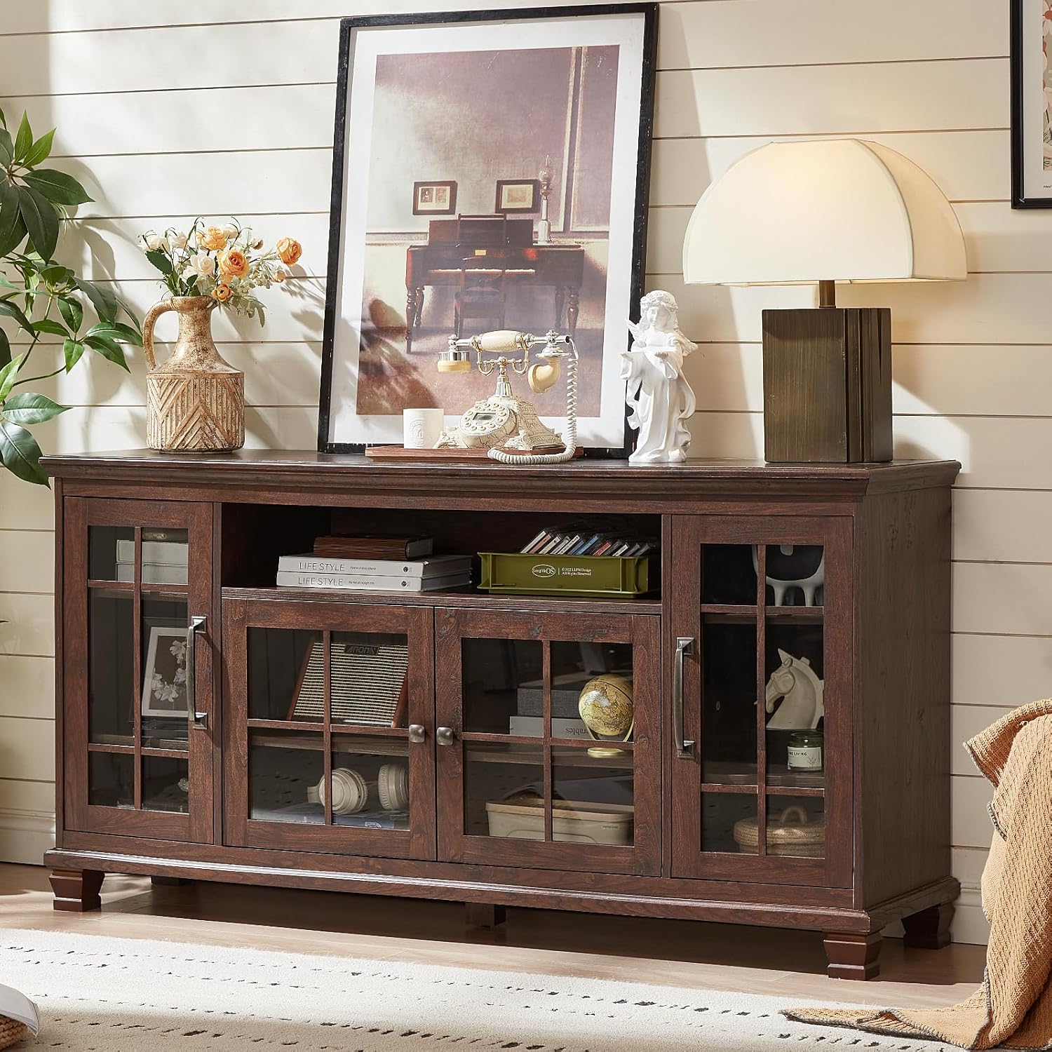 Vintage-style large storage cabinet, featuring antique walnut wooden grain finish to evoke a rustic farmhouse ambiance.Sturdy tempered glass showcases your tableware collection, creating a mid-century display effect while protecting items from dust.Open shelving & spacious tabletop provide easy access to your tableware.