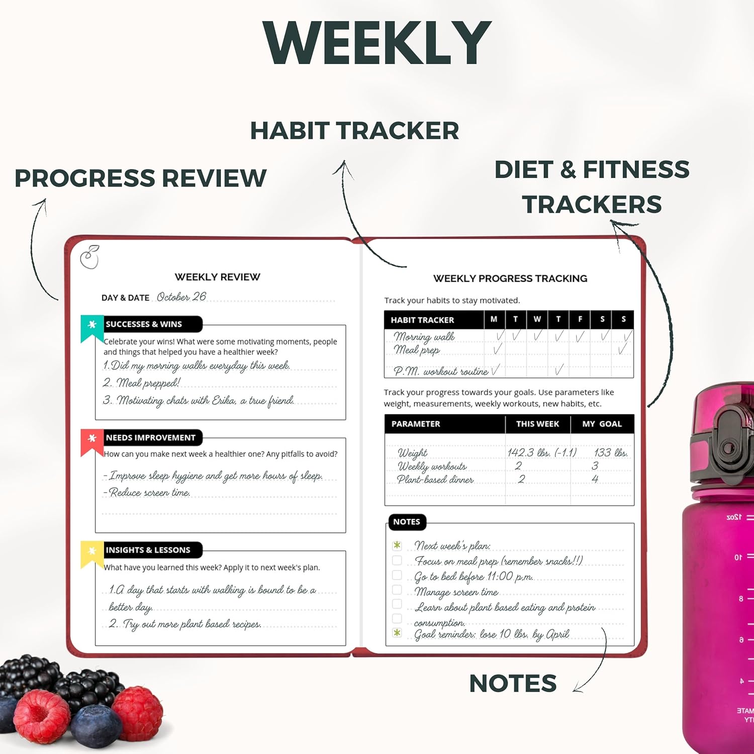 Life & Apples Wellness Journal Planner – Food Log, Fitness Tracker, Habit Tracker, Weight Loss Journal for Diet Tracking and Health Goals, Undated, Size A5 Berry
