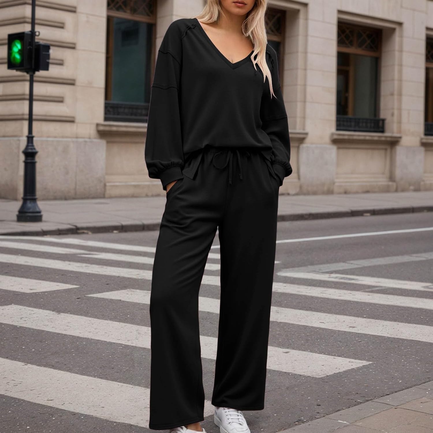 Lounge Sets for Women Two Piece Airport Outfits V Neck Wide Leg Drawstring Tracksuit Matching Sweatsuits Set Fall Clothes