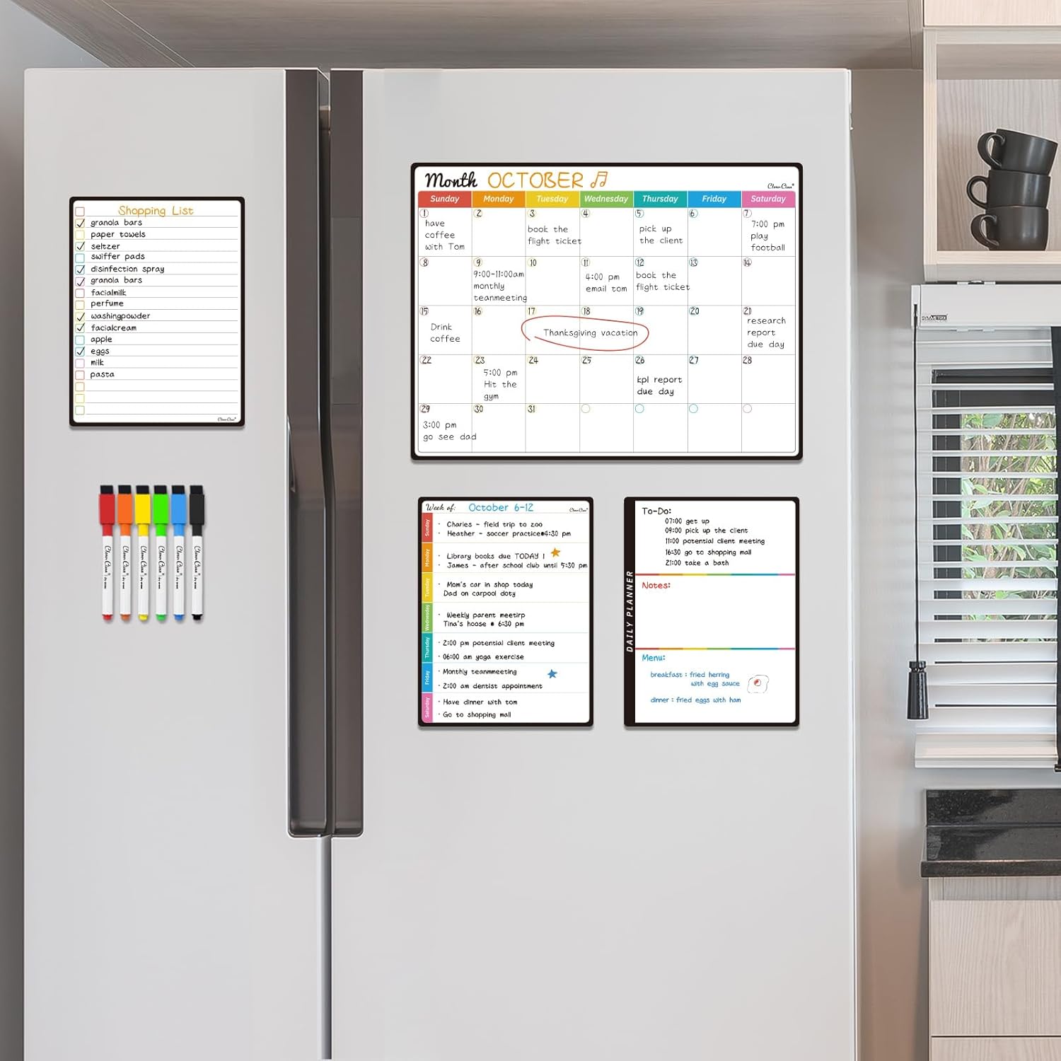 Magnetic Dry Erase Monthly Calendar Set – 14.5″x11″ Monthly Calendar, 6.5″x8.5″ Weekly, Daily, List Boards for Fridge – 6 Extra Fine Point Markers Included – Shipped Flat