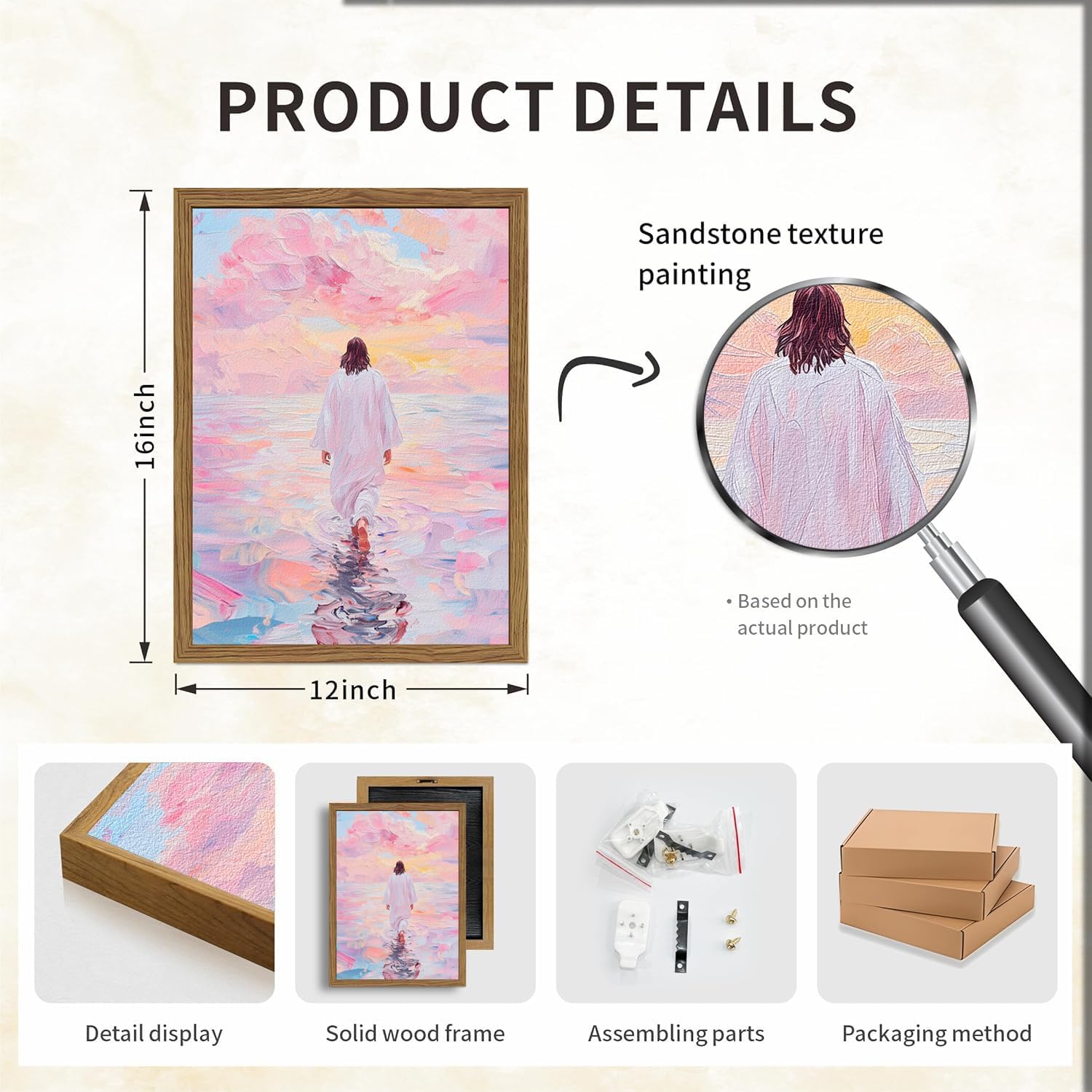 I love this picture of Jesus. It is an amazing quality especially for the price. The frame is a quality wood. The painting is textured and gives it a 3D look. It is artistic, decorative, beautiful, but also meaningful. I ordered the 24 x 16 and it is a good size for a small/medium wall. We have 9ft ceilings and it looks great. I definitely recommend this and I looked all over before making this purchase.