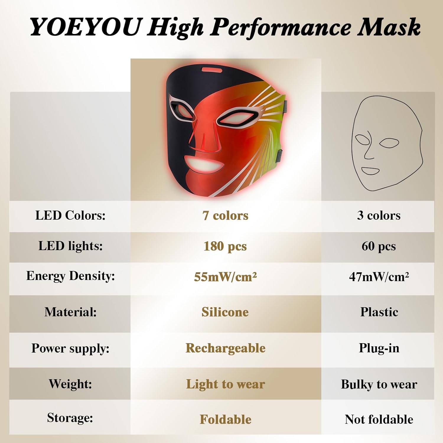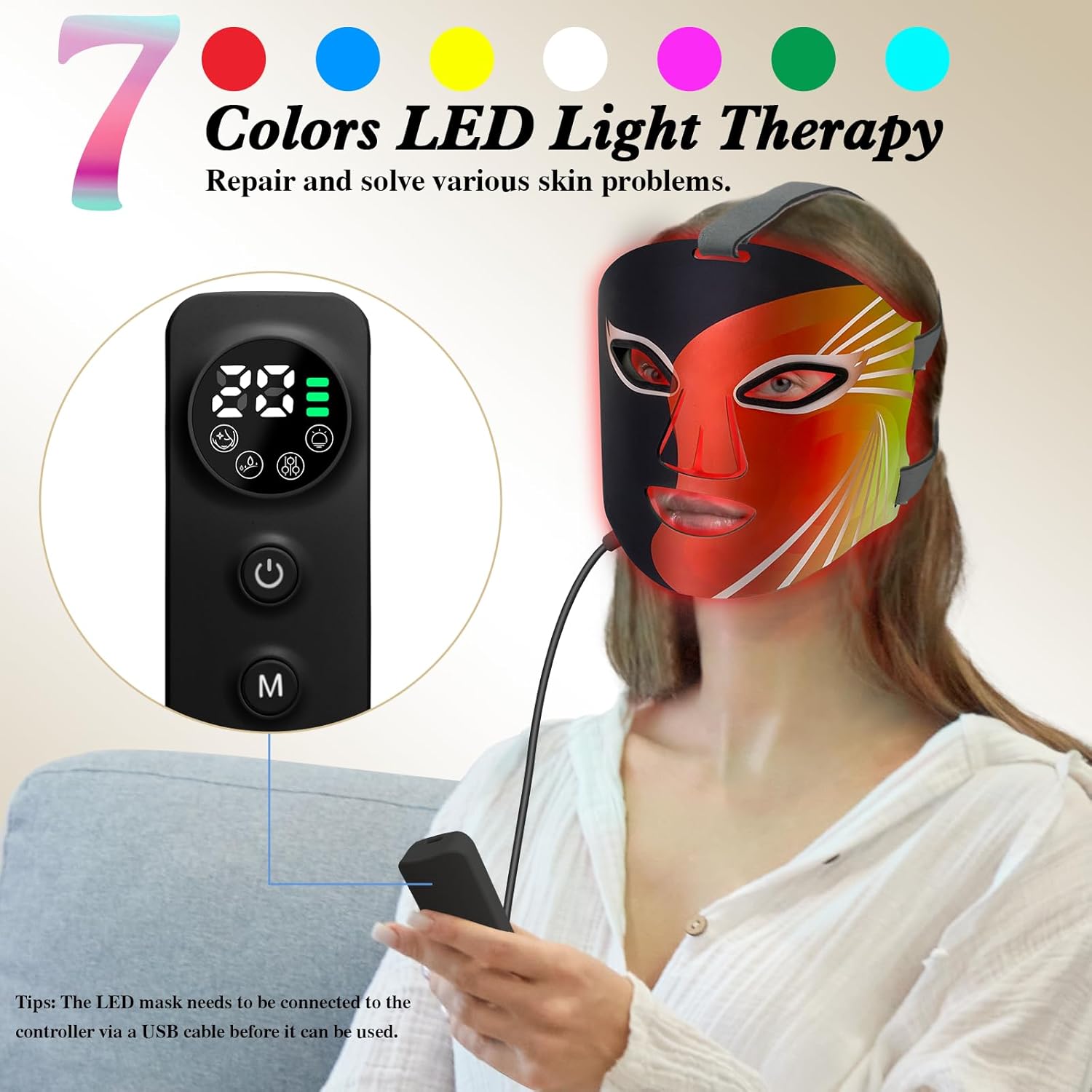 7 Colors Light Therapy Mask: YOEYOU red light therapy for face possession 7 colors light therapy, different wavelengths of light are suitable for different types of skin. Multiple light wave matrices to deeply penetrate skin cells, reshape skin vitality from the inside out, and improve skin condition. 👉The LED mask needs to be connected to the controller via a USB cable before it can be used.