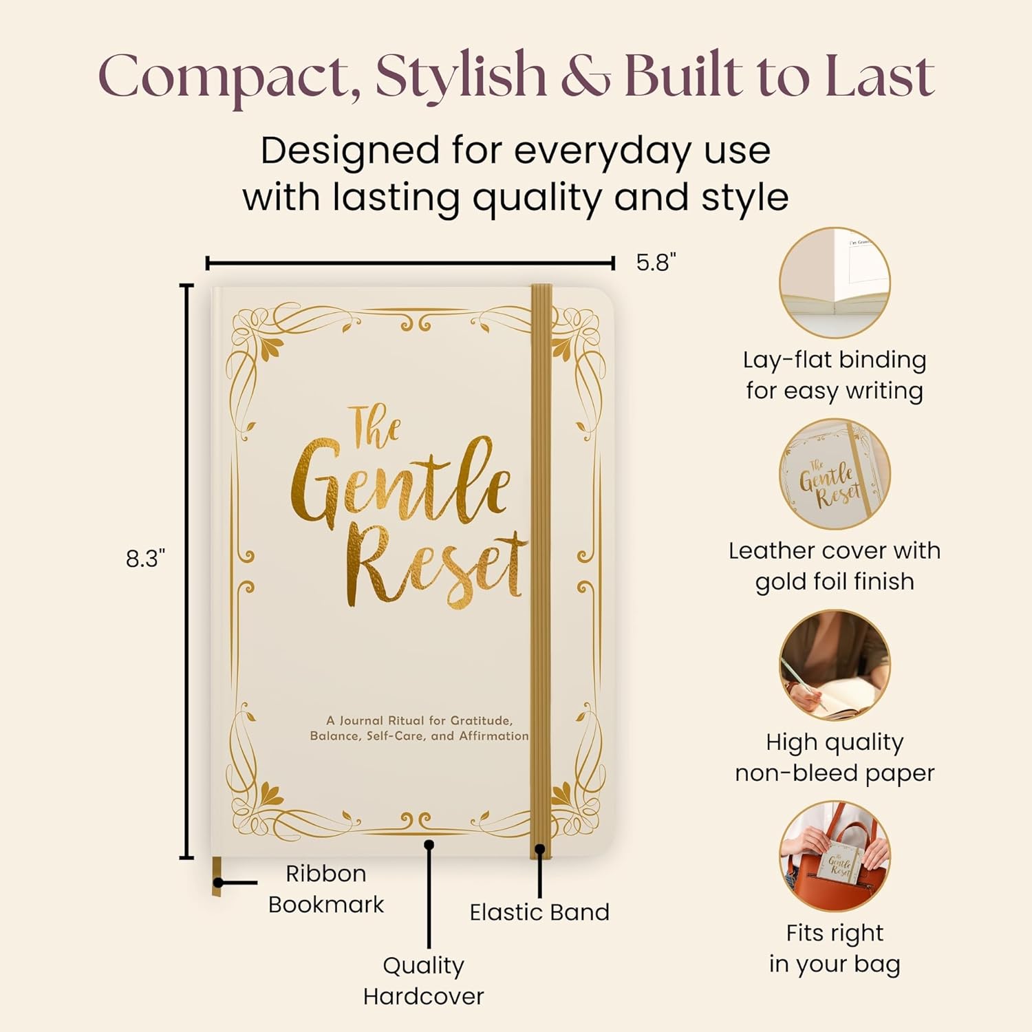 Daily Reflection Journal for Women with Premium Design – This daily reflection journal for women features a durable hardcover, bleed-resistant pages, and a lay-flat binding for easy writing. Compact and lightweight, it’s perfect for home, office, or travel. The Gentle Reset is both functional and beautiful, turning your daily gratitude journal practice into a cherished ritual. Ideal for busy women seeking mindfulness and self-care every day.