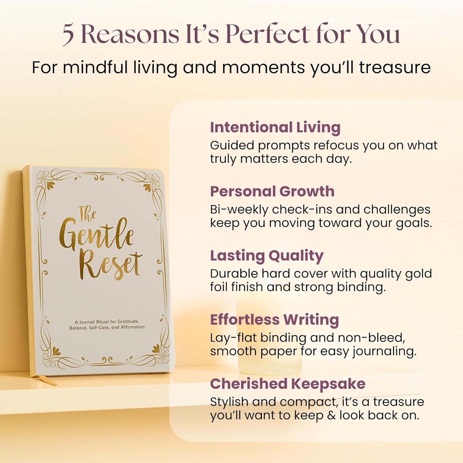 The gentle reset appears to be a thoughtfully designed daily journal and promoting happiness, self care, and a positive mindset. It is specifically structured to make daily reflection approachable and manageable, even for those new to journaling or who are short on time. It’s a great value for your money the right and space is perfect. The journal seems I did for women looking for structured way to incorporate a daily self improvement habit into their daily lives.