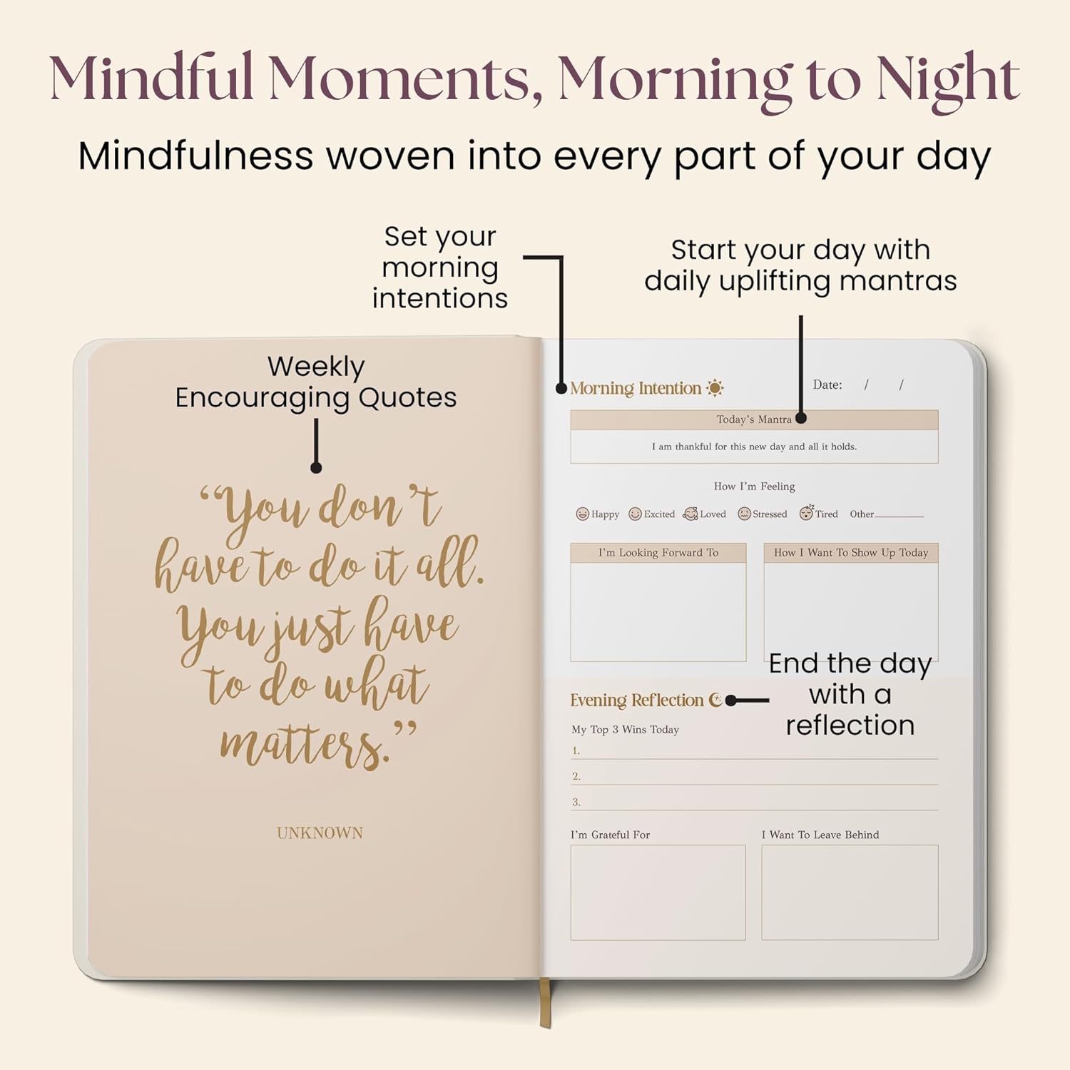 Transform your days with daily prompts for gratitude, mindfulness, and balance in just five minutes.