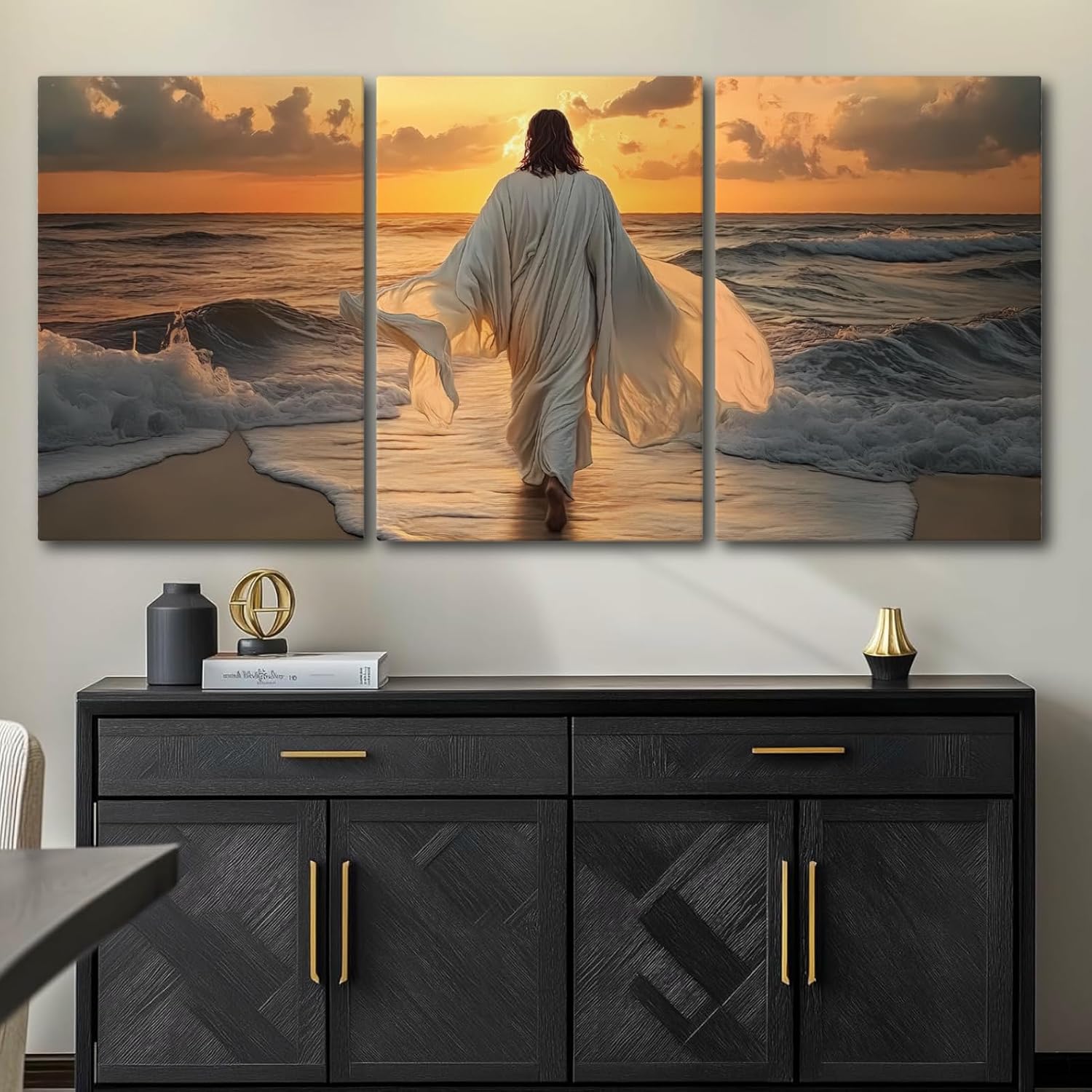Plum Blossom Wall Art:This is a triptych that shows Jesus in a white robe walking towards the sea at dusk. The painting is set against a warm sunset, with waves rolling and the figure’s robe fluttering in the wind, creating a tranquil, sacred and religious atmosphere, conveying emotions and spiritual connotations such as salvation and guidance