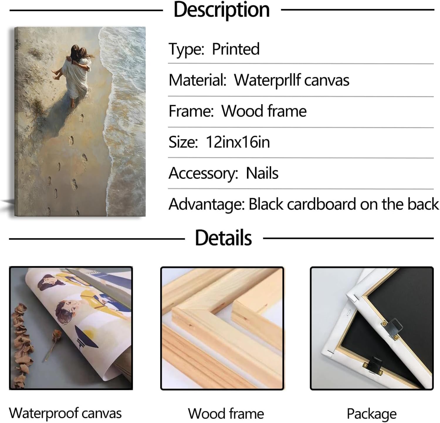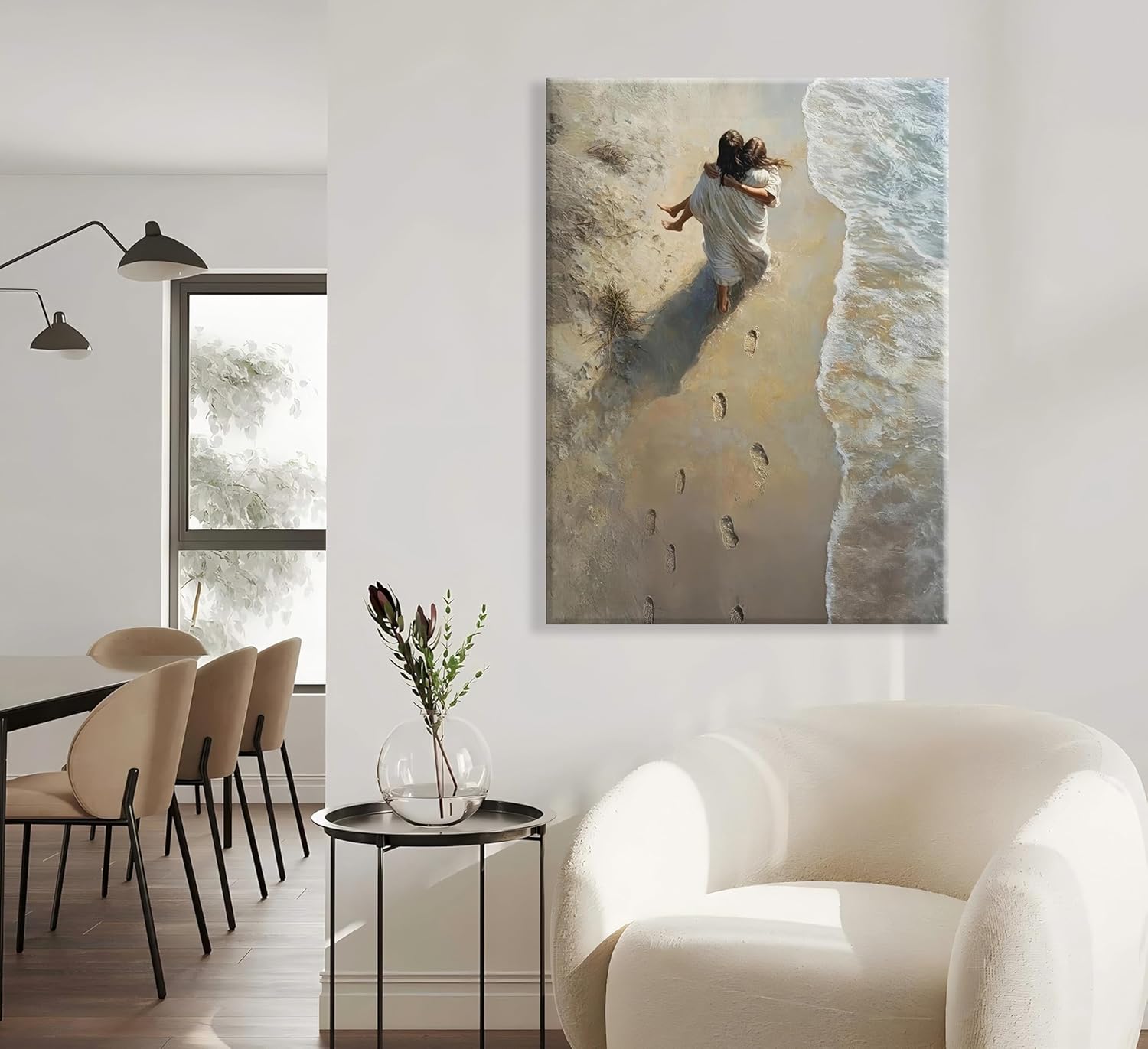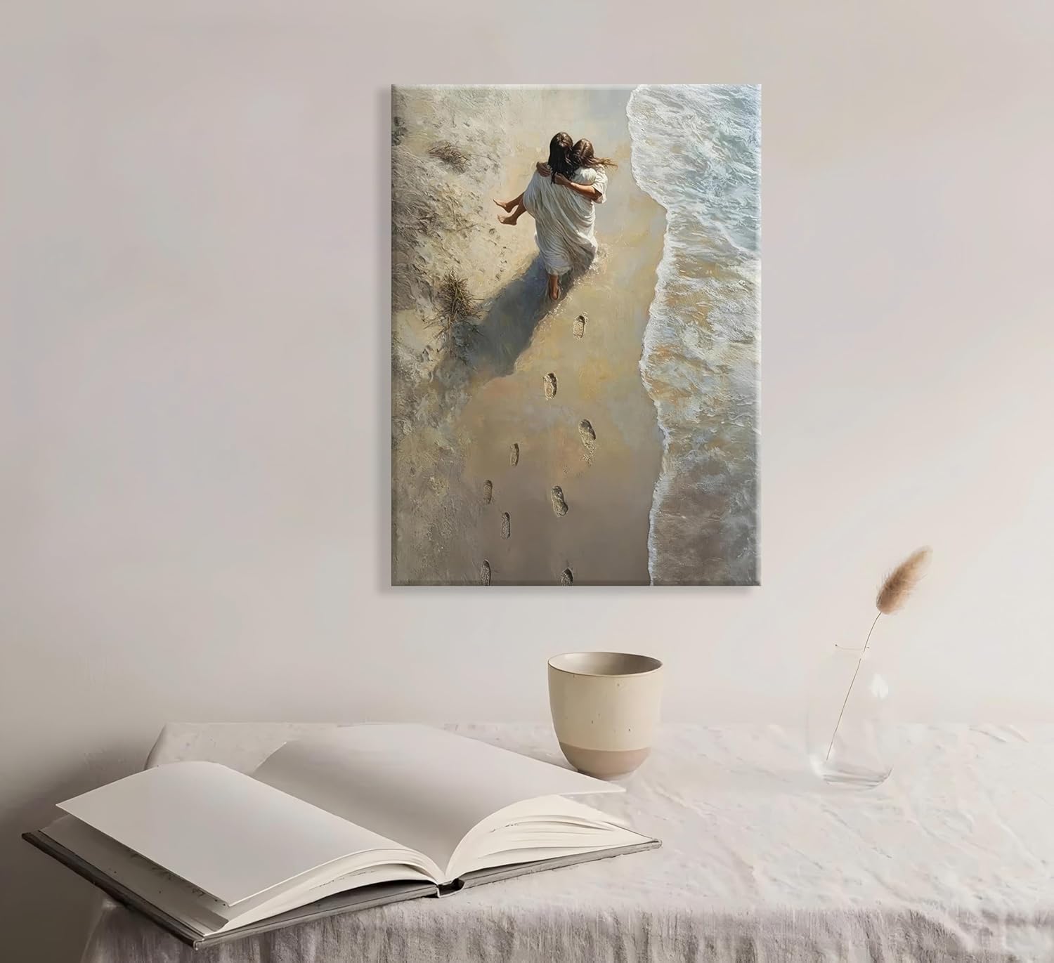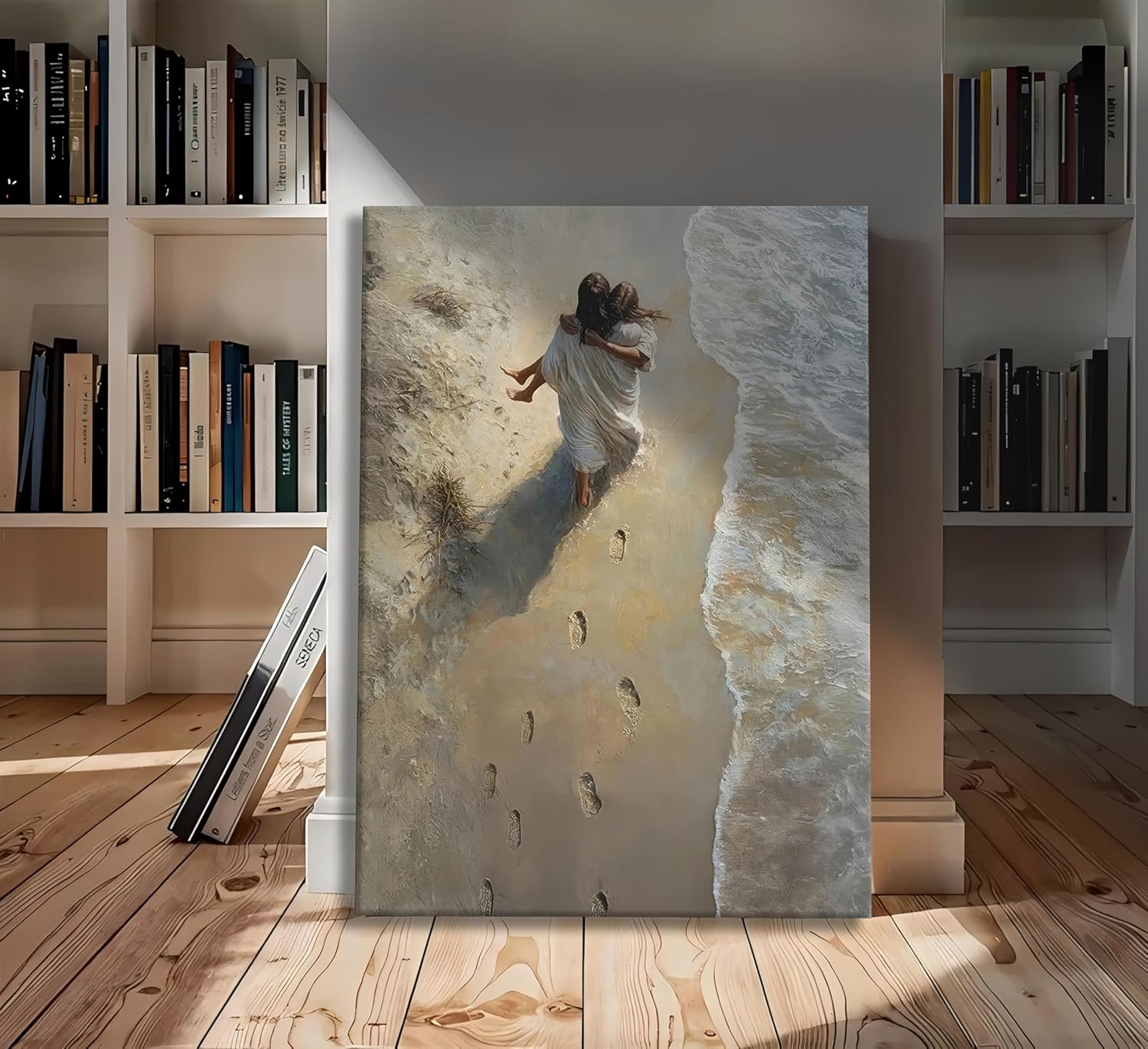 YOXORDQ Jesus Holding Woman Canvas Wall Art Jesus Walking on The Beach Picture Prints Footprints on The Bbeach Painting Poster for Christian Women Living Room Bedroom Wall Decor 12x16in Framed